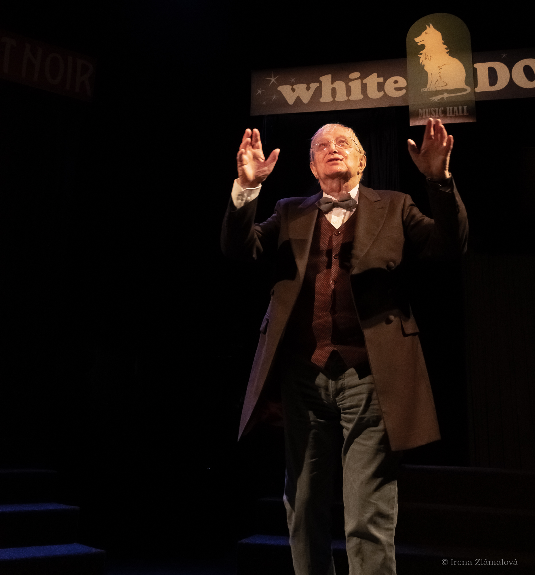 Černá kočka - Bílý pes jsou v našem příběhu dva kabarety. Zatímco ten první (Chat noir) byl založen v Paříži roku 1881 ten druhý (White dog) vznikl roku 2020. V Chat noir vládne Jitka Molavcová, ve White dog je šéfem Jiří Suchý. Rivalita těchto dvou podniků má svůj příběh - pokud vás zajímá jaký, přijďte se podívat. Vokální pánská skupina Smoking Boys a dámské trio Palačinky pestří večer známými i neznámými písněmi.